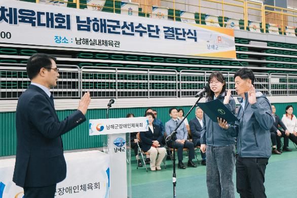 이날 결단식에는 장애인체육회장인 장충남 군수를 비롯해 남해군체육회 강경삼 회장과 장애인 시설·단체장, 장애인체육회 임원 등 30여 명, 선수단 150여 명이 참석해 선전을 기원했다.
