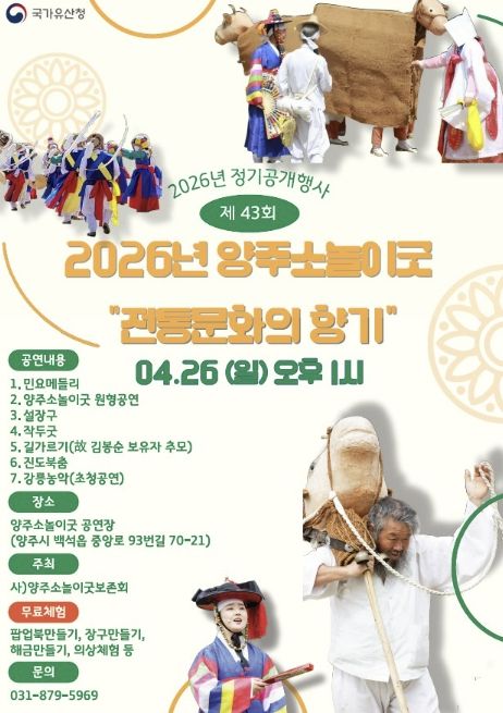 내고향뉴스 김명신 기자 | 양주시는 국가유산청의 지원을 받아 ‘제43회 양주소놀이굿 정기공개행사’를 오는 26일 오후 1시, 양주소놀이굿 전수교육관 공연장에서 개최한다고 밝혔다.