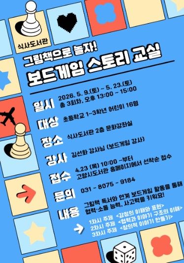 내고향뉴스 김명신 기자 | 고양특례시 식사도서관이 오는 5월 9일부터 공공도서관 독서문화 프로그램 ‘그림책으로 놀자! 보드게임 스토리 교실’을 운영한다.