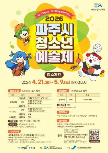 내고향뉴스 김명신 기자 | (재)파주시청소년재단 금촌청소년문화의집은 오는 4월 21일부터 5월 9일까지 ‘2026 파주시청소년예술제’ 참가자를 모집한다고 밝혔다. 올해‘Be Happy, 무대위에 피어나다’를 부제로 개최되는 이번 예술제는 제34회 경기도청소년예술제 파주시 공식 예선으로, 파주시 청소년이라면 누구나 참가 신청이 가능하다.