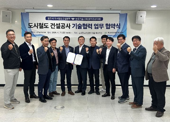 내고향뉴스 장우석 기자 | 광주광역시 도시철도건설본부는 21일 본부 8층 대회의실에서 한국기술사회 광주·전남지회와 ‘광주시 도시철도 2호선 건설공사 기술협력 업무협약’을 체결했다.
