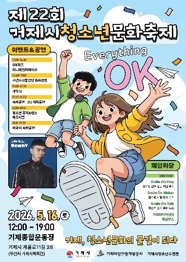 내고향뉴스 김명신 기자 | 거제시는 오는 2026년 5월 16일 12:00~19:00, 거제종합운동장(우천 시 거제시체육관)에서 제22회 거제시청소년문화축제 “Everything OK”를 개최한다.