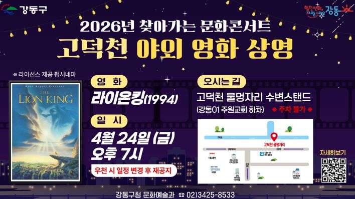 내고향뉴스 김명신 기자 | 서울 강동구는 오는 24일 오후 7시, 고덕천 물멍자리 수변스탠드(주원교회 맞은편)에서 ‘2026년 찾아가는 문화콘서트’ 3회차 프로그램으로 미디어파사드를 활용한 야외 영화 상영을 진행한다고 밝혔다.