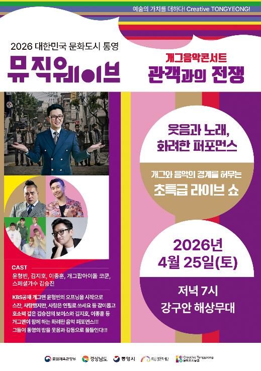 내고향뉴스 김명신 기자 | (재)통영문화재단은 오는 25일 오후 7시 강구안 해상무대에서 2026년 뮤직웨이브 정기공연으로 음악과 개그의 경계를 허무는 특급 라이브쇼 개그음악콘서트 ‘관객과의 전쟁’공연을 진행한다.