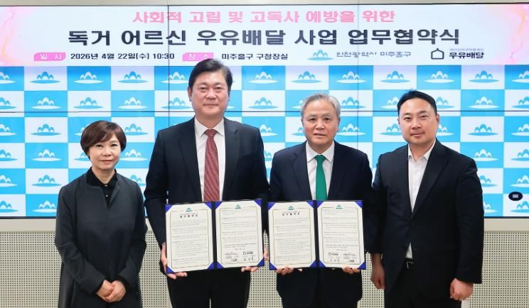 내고향뉴스 채승병 기자 | 인천 미추홀구는 22일 (사)어르신의 안부를 묻는 우유배달과 독거 어르신의 건강한 생활 지원 및 고독사 예방을 위한 ‘어르신의 안부를 묻는 우유배달 사업’ 업무협약을 체결했다.