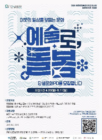 ‘단샘문화PD’는 지역 문화 프로그램을 직접 기획·운영하는 전문 인력으로, 이번 공모를 통해 '예술로, 돌봄' 사업의 핵심 기획자로 활동하게 된다.