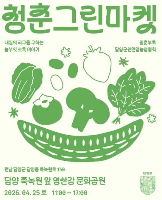 내고향뉴스 김명신 기자 | 담양군친환경농업협회가 오는 25일 오전 11시부터 오후 5시까지 죽녹원 앞 영산강 문화공원에서 ‘제2회 청춘그린마켓’을 연다.