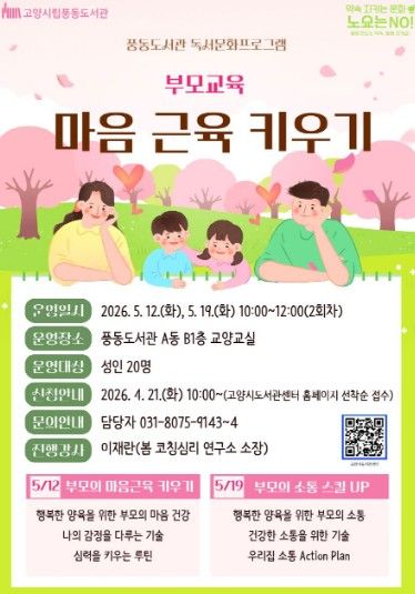 내고향뉴스 김명신 기자 | 고양특례시 풍동도서관은 오는 5월 독서문화 프로그램 ‘부모교육, 마음 근육 키우기’를 진행한다고 22일 밝혔다.