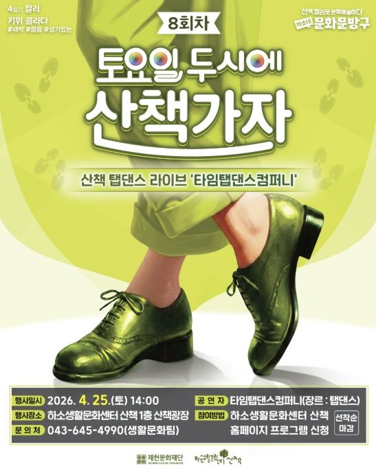 내고향뉴스 김명신 기자 | 제천문화재단이 운영하는 하소생활문화센터 ‘산책’에서 매주 토요일 시민들과 함께하는 문화예술 프로그램 '토요일 두시에 산책가자'의 여덟 번째 무대로 ‘탭댄스 공연’을 선보인다.