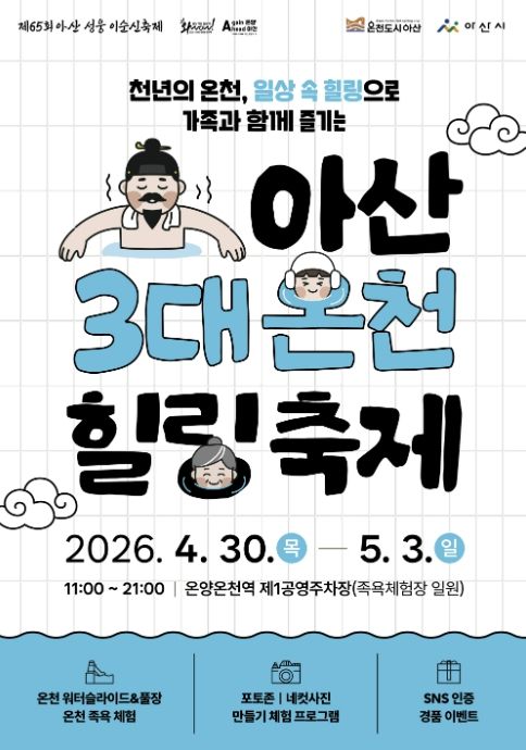 고영이 관광진흥과장은 “이번 온천힐링축제는 아산의 우수한 온천 자원을 한자리에 모아 체험과 홍보를 결합한 것이 가장 큰 특징”이라며 “시민과 관광객 모두가 일상에서 벗어나 힐링과 여유를 만끽할 수 있는 축제가 될 것으로 기대한다”고 밝혔다.