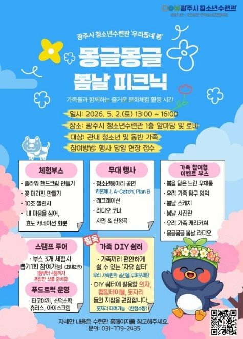 내고향뉴스 김명신 기자 | 광주시 청소년수련관은 오는 5월 2일 오후 1시부터 수련관 1층 앞마당 및 로비에서 ‘2026년 우리동네 봄 몽글몽글 봄날 소풍’을 개최한다고 23일 밝혔다.