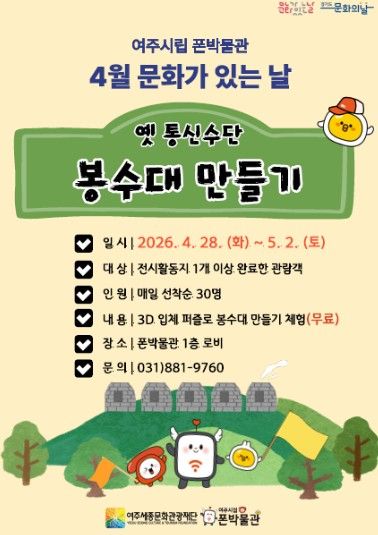 내고향뉴스 김명신 기자 | 여주세종문화관광재단이 운영하는 여주시립 폰박물관은 4월 '문화가 있는 날'을 맞아 오는 4월 28일부터 5월 2일까지 시민 참여형 체험 행사 '소식을 전하던 봉수대 만들기'를 운영한다.