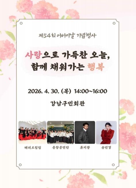 내고향뉴스 김명신 기자 | 꿈이 모이는 도시, 미래를 그리는 강남구가 제54회 어버이날을 맞아 4월 30일 오후 2시부터 4시까지 강남구민회관에서 기념행사를 개최하고, 5월 8일에는 7개 노인복지관에서 다채로운 행사를 이어간다.