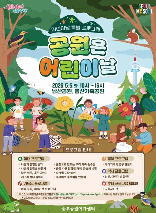 어린이날 특별프로그램은 4월 24일 14시부터 서울시공공서비스예약 누리집을 통해 참여 신청이 가능하며, 자세한 내용은 중부공원여가센터 공원여가과로 문의하면 된다.