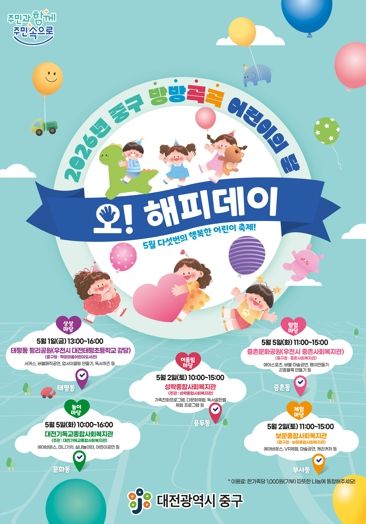 내고향뉴스 김명신 기자 | 대전 중구가 다가오는 5월 1일부터 5일까지 '2026년 중구 방방곡곡 어린이의 달 오! 해피데이' 어린이달 축제를 개최한다고 밝혔다.
