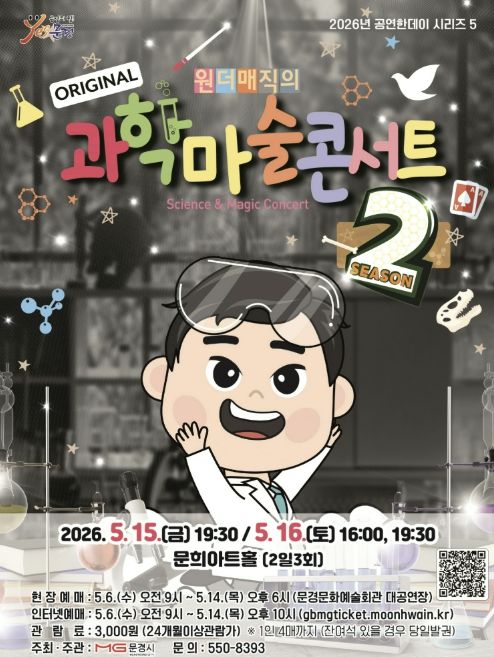 내고향뉴스 김명신 기자 | 문경문화예술회관에서는 5월 어린이 달을 맞아 마술과 과학의 경계를 넘나들며 온가족 모두가 재미있게 관람할 수 있는 과학마술콘서트 시즌2 공연을 5월 15일 19:30, 16 16:00, 19:30 (2일 3회)에 문희아트홀에서 개최한다.