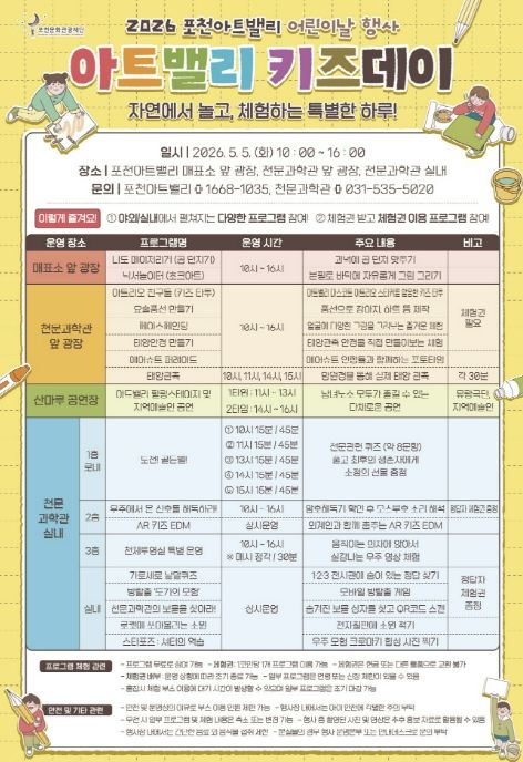 내고향뉴스 김명신 기자 | 포천문화관광재단이 운영하는 포천아트밸리는 오는 5월 5일 어린이날을 맞아 어린이와 가족을 위한 체험형 문화행사 ‘아트밸리 키즈데이’를 개최한다.