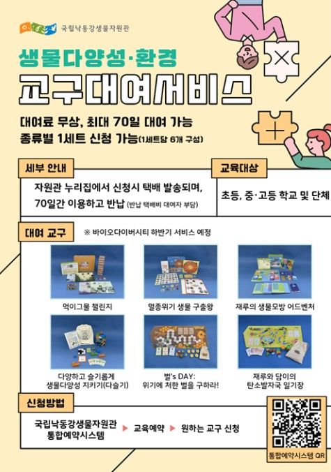 내고향뉴스 윤환열 기자 | 기후에너지환경부 산하 국립낙동강생물자원관은 학교 및 교육기관을 대상으로 4월 27일부터 ‘교구 대여 서비스’와 ‘온라인 생물·환경 교실’ 참여 신청을 받는다고 밝혔다.