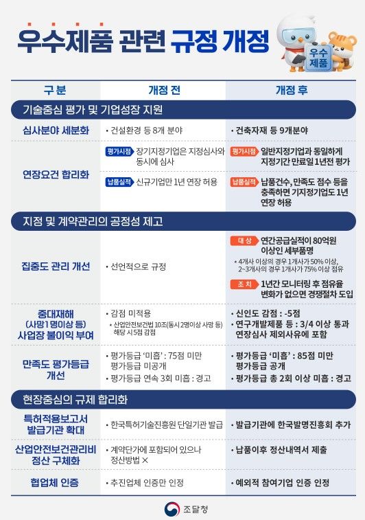 내고향뉴스 임정빈 기자 | 조달청은 기업의 성장을 지원하고, 공정한 경쟁환경을 조성하기 위해 우수조달물품 관련 규정을 개정하여 4월 27일부터 시행한다고 밝혔다.