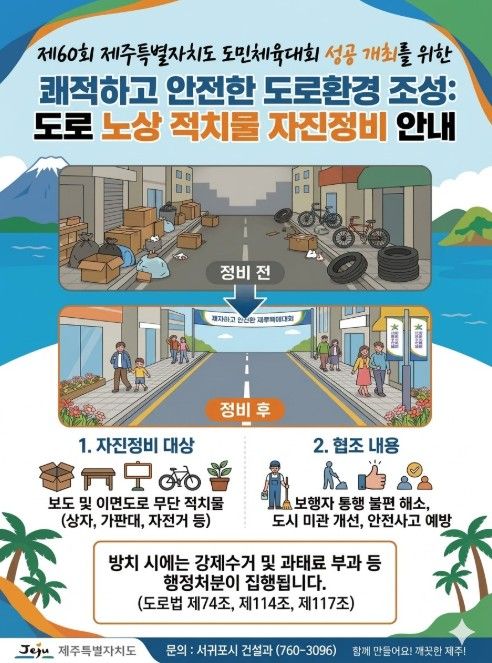 서귀포시 관계자는 “2026년 체전은 전국의 선수단과 관광객이 서귀포를 찾는 대규모 행사인 만큼, 도로 환경 정비가 무엇보다 중요하다”라며, “쾌적한 가로 환경 조성과 안전한 보행권 확보를 위해 시민 여러분의 적극적인 자발적 정비와 협조를 부탁드린다”라고 전했다.