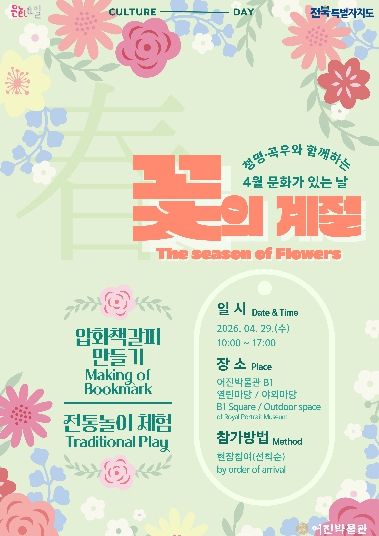 하재식 전주시 국가유산관리과장은 “문화가 있는 날을 맞아 박물관을 찾은 누구나 쉽게 참여할 수 있는 체험 프로그램을 준비했다”면서 “시민과 관람객들이 박물관에서 준비한 프로그램을 통해 하늘이 맑아지고 봄비가 내리는 꽃의 계절을 느껴보는 시간이 되길 바란다”고 말했다.