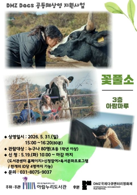 내고향뉴스 김명신 기자 | 고양특례시 아람누리도서관은 DMZ국제다큐멘터리영화제와 협업해 오는 5월 31일 오후 3시, 도서관 3층 아람마루에서 다큐멘터리 영화 ‘꽃풀소’ 상영회를 개최한다.