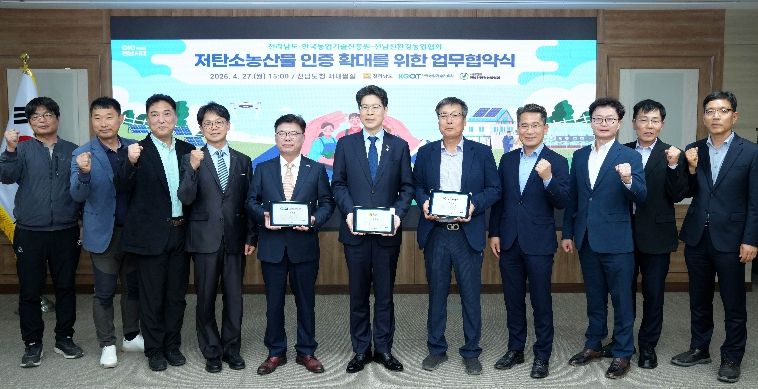 내고향뉴스 윤환열 기자 | 전라남도는 27일 도청에서 한국농업기술진흥원, 전남친환경농업협회와 함께 저탄소 농산물 인증 확대와 탄소 저감 실천을 위한 업무협약을 했다.