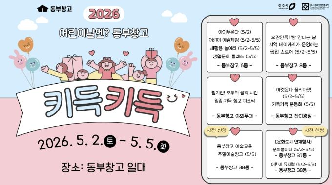 내고향뉴스 김명신 기자 | 청주시와 청주시문화산업진흥재단은 가정의 달 5월을 맞아 오는 5월 2일부터 5일까지 동부창고 일원에서 어린이날 행사 ‘키득키득’을 연다.