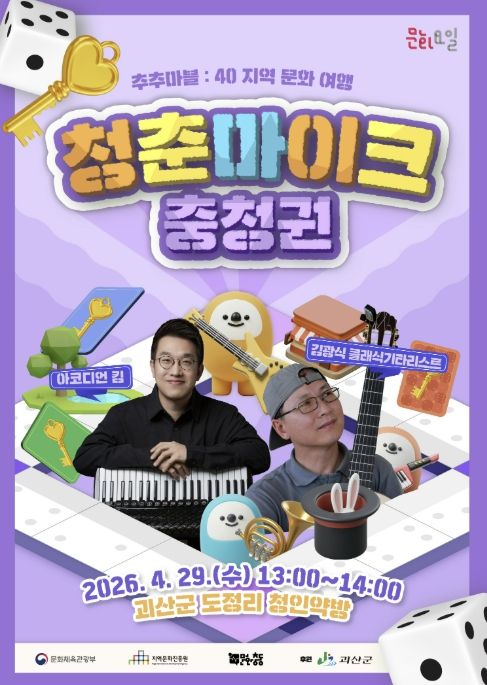 내고향뉴스 김명신 기자 | 충북 괴산군은 지역 공간과 함께하는 거리공연 ‘청춘마이크’가 오는 29일과 5월 3일 두 차례에 걸쳐 개최된다고 밝혔다.