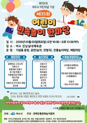 내고향뉴스 김명신 기자 | 여수시는 제104회 어린이날을 맞아 5월 5일, 아이들이 가족과 함께 전통문화를 즐기며 마음껏 뛰놀 수 있는 민속놀이 놀이 한마당을 개최한다.