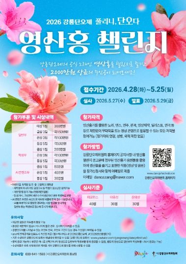 이번 챌린지는 노래, 댄스, 연주, 편곡, 영상 제작, 일러스트, 연극 등 장르 제한 없이 영산홍가를 활용한 콘텐츠라면 자유롭게 참여할 수 있다. 특히 강릉단오제를 상징하는 포인트 안무나 구간이 포함될 경우 가산점이 부여된다.