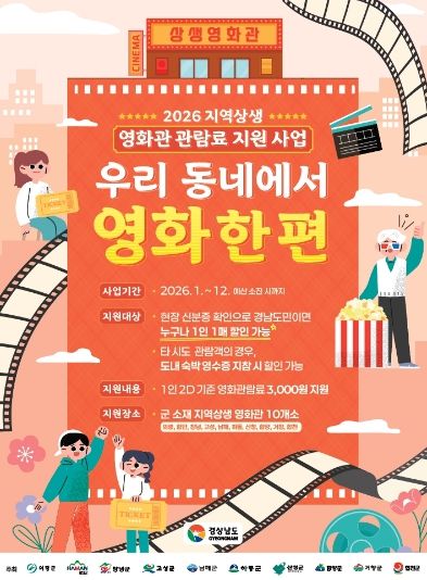 내고향뉴스 김명신 기자 | 거창군은 다가오는 5월 가정의 달을 맞이해 군민들의 문화 향유 기회를 확대하고 지역 영화관의 활성화를 돕기 위해 ‘2026년 지역상생 영화관 관람료 지원사업’을 시행한다.
