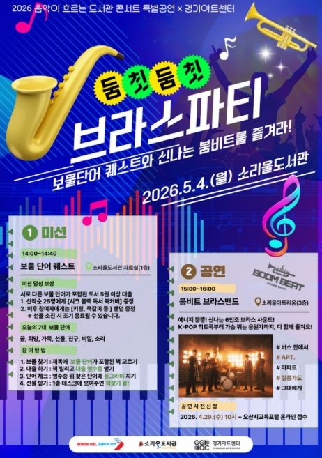 내고향뉴스 김명신 기자 | 오산시 소리울도서관은 제104회 어린이날을 앞둔 오는 5월 4일 경기아트센터와 협업해 ‘2026 음악이 흐르는 도서관 콘서트’ 특별공연인 ‘둠칫둠칫 브라스 파티’를 개최한다고 밝혔다.