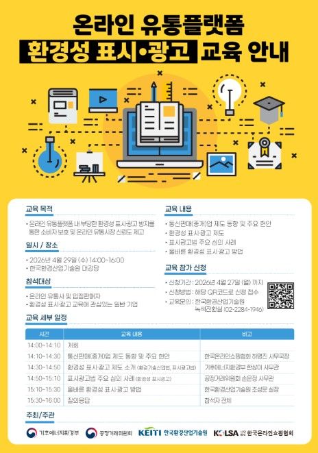 내고향뉴스 윤환열 기자 | 공정거래위원회와 기후에너지환경부는 4월 29일 한국환경산업기술원 대강당(서울 은평구 소재)에서 온라인 유통사를 대상으로 ‘환경성 표시·광고 교육’을 개최한다고 밝혔다.