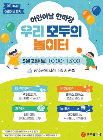 내고향뉴스 김명신 기자 | 광주광역시는 어린이날을 기념해 오는 5월 2일 오전 10시부터 오후 1시까지 시청 1층 시민홀에서 특별행사를 연다.