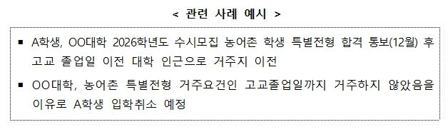 교육부는 올해 입시에서도 유사한 사례가 반복된 점을 엄중히 인식하고 지난 4월 9일 적극행정위원회의 심의를 거쳐 2026학년도 피해학생의 권리구제 및 향후 해당 사례의 재발을 막기 위한 권고사항을 대학에 안내하기로 결정했다. 특히, 농어촌 학생 특별전형 합격자가 발표된 이후의 거주지 변경은 전형 결과에 미치는 영향이 없고, 관련 판례가 일관되게 피해 학생의 권리구제를 우선하여 판시하고 있는 점을 중점적으로 고려했다.