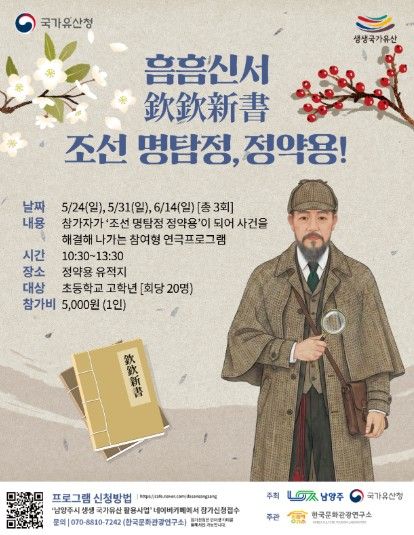 내고향뉴스 김명신 기자 | 남양주시는 오는 5월 24일과 31일, 6월 14일 정약용 유적지에서 초등학교 고학년을 대상으로 참여형 연극 프로그램 ‘흠흠신서: 조선 명탐정, 정약용!’ 참가자를 모집한다고 밝혔다.
