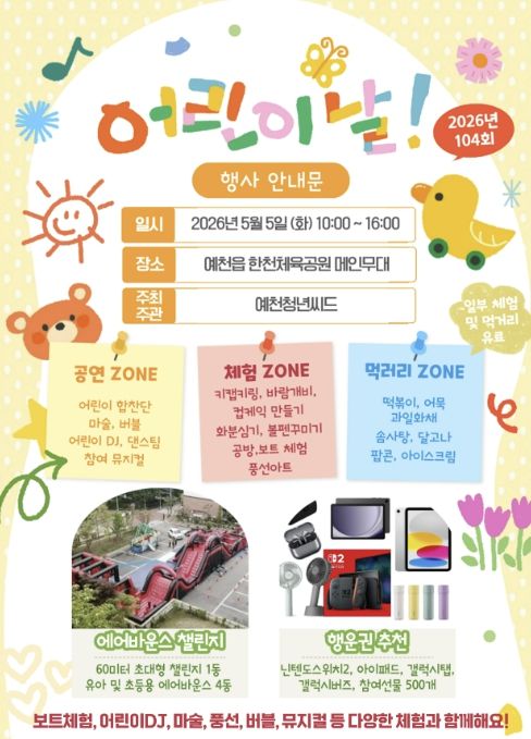 내고향뉴스 김명신 기자 | 예천군은 제104회 어린이날을 맞아 오는 5월 5일 오전 10시부터 오후 4시까지 한천체육공원 메인무대 일원에서 ‘2026년 제104회 예천군 어린이날 기념행사’를 개최한다.