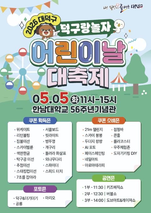 내고향뉴스 김명신 기자 | 대전 대덕구는 제104회 어린이날을 맞아 아동과 가족이 함께 즐길 수 있는 ‘덕구랑 놀자! 대덕구 어린이날 대축제’를 개최한다고 밝혔다.