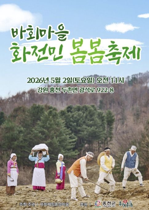 내고향뉴스 김명신 기자 | 홍천 산골 마을에서 화전민의 삶과 봄의 식문화를 한자리에서 체험할 수 있는 ‘화전민 봄봄 축제’가 열린다. 홍천군 두촌면 바회 마을은 오는 5월 2일 오전 11시부터 마을 일원에서 주민 참여형 축제를 개최한다.
