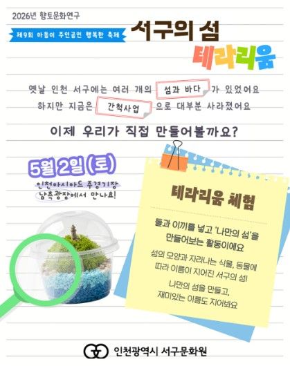 내고향뉴스 김명신 기자 | 인천광역시 서구문화원은 오는 5월 2일 인천아시아드주경기장 남측광장에서 열리는 제9회 아동이 주인공인 행복한 축제’에서 ‘서구의 섬, 테라리움 만들기’ 체험 부스를 운영한다고 밝혔다.