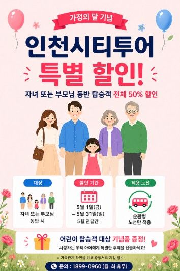 내고향뉴스 김명신 기자 | 인천관광공사는 5월 가정의 달을 맞아 가족 단위 관광객 유입을 확대하고 이용객의 재방문 활성화를 위한‘인천시티투어 특별 프로모션’을 실시한다고 밝혔다