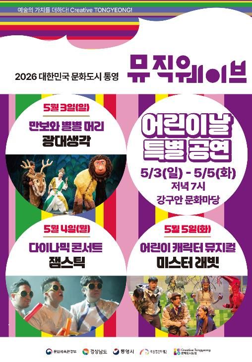 내고향뉴스 김명신 기자 | (재)통영문화재단은 어린이날을 맞아 오는 5월 3일부터 5일까지 3일간 오후 7시 강구안 문화마당에서 2026 뮤직웨이브 어린이날 특별공연‘만보와 별별머리’,‘다이나믹 콘서트’,‘미스터 래빗’을 진행한다.