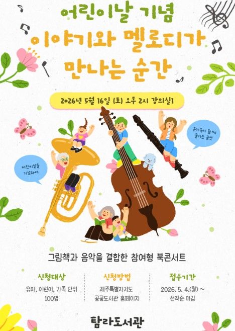 문정희 탐라도서관장은 “가정의 달을 맞아 건강한 가족 문화를 형성하고, 어린이들이 이야기와 음악을 함께 접할 수 있는 기회를 통해 문화 감수성이 향상되길 바란다”고 말했다.