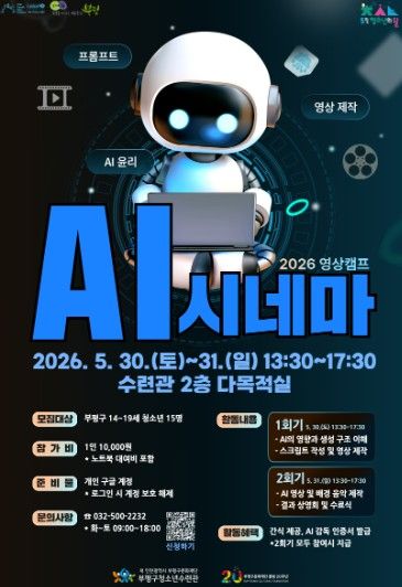 내고향뉴스 김명신 기자 | 부평구청소년수련관은 오는 5월 30일부터 31일까지 진행하는 ‘2026 영상캠프 AI 시네마’ 참가자를 모집한다고 밝혔다.