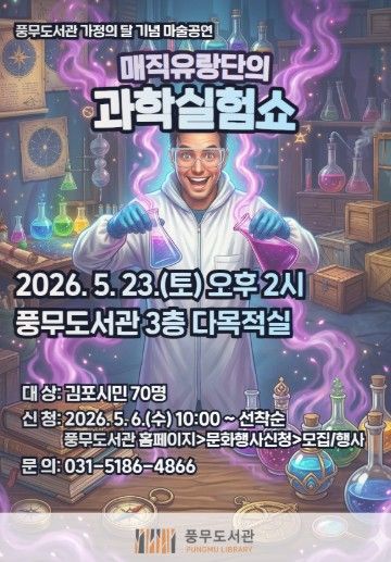 내고향뉴스 김명신 기자 | 김포시 풍무도서관에서는 5월 23일 오후 2시부터 3시까지 마술공연 ‘매직유랑단의 과학실험쇼’를 운영한다. 가정의 달을 맞아 도서관 이용 가족에게 특별한 문화 향유 기회를 제공하고자 기획된 공연이다.