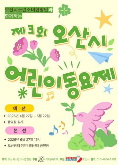 참가 대상은 오산시에 거주하는 7세 어린이부터 초등학생까지 동요를 좋아하는 아동이며, 참가비는 무료다. 예선 심사를 통해 선발된 총 15개 팀이 본선 무대에 오른다.
