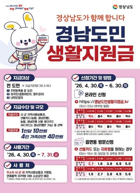 내고향뉴스 김익성 기자 | 경상남도는 4월 30일부터 전 도민을 대상으로 한 ‘경남도민 생활지원금’ 지급 신청을 본격적으로 시작한다고 밝혔다. 이번 지원금은 고물가 등 어려운 경제 여건 속에서 도민들의 생계 부담을 덜고, 지역 내 소비를 촉진해 민생 경제에 활력을 불어넣기 위해 마련됐다.