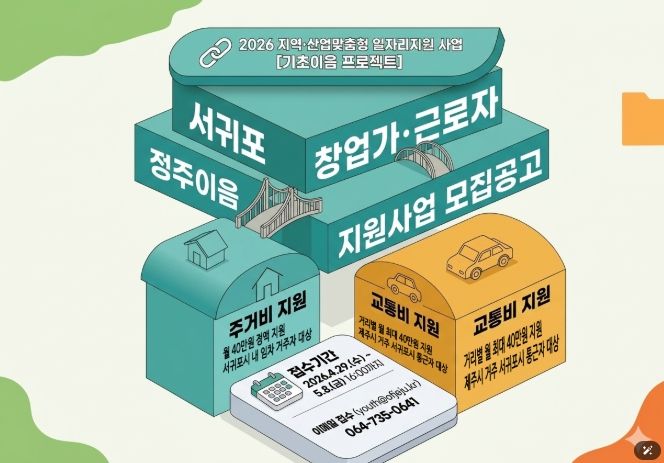 내고향뉴스 김명신 기자 | 제주특별자치도와 제주콘텐츠진흥원(원장 강민부)은 고용노동부와 함께 서귀포시 창업 생태계 활성화와 우수 인력의 안정적인 지역 정착을 위해 '2026 서귀포 창업가·근로자 정주이음 지원사업' 참여자를 모집한다.