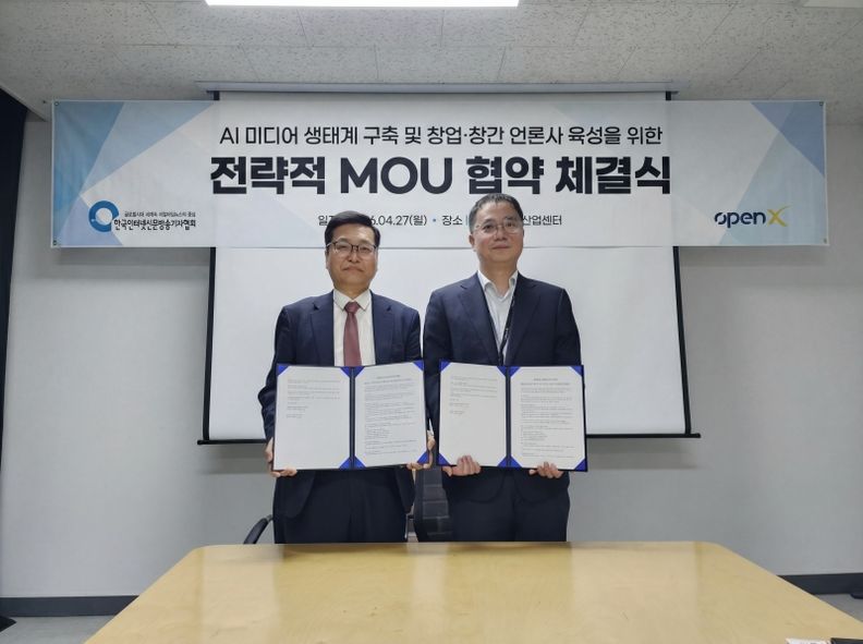 내고향뉴스 채필재 기자 | 한국인터넷신문방송기자협회(회장 전병길, 이하 협회)와 오픈엑스(대표 김미진)는 지난 2026년 4월 27일 서울 상암동 DMC첨단산업센터에서 업무협약(MOU)을 체결하고, 제휴 언론사 육성과 건강한 미디어 생태계 강화를 위해 적극 협력하기로 뜻을 모았다.